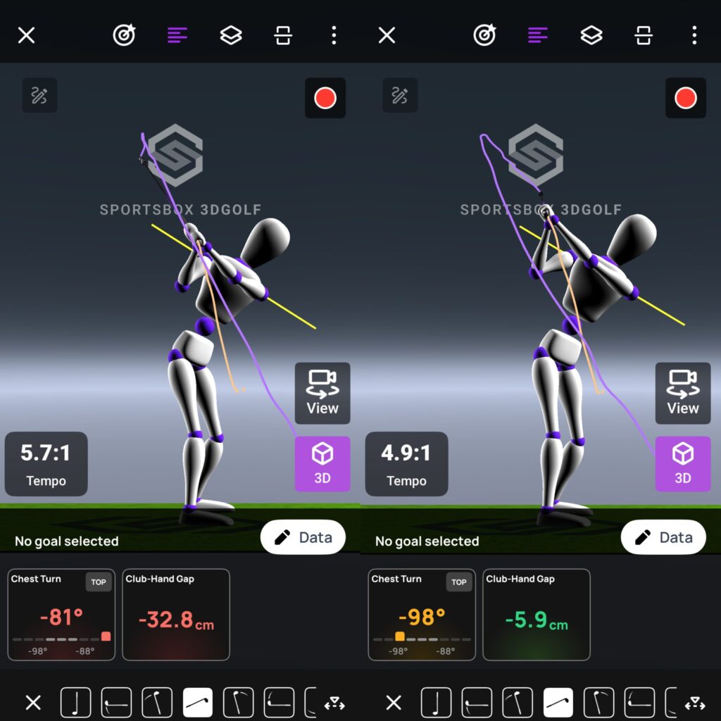 左のビフォーは、胸の回転がマイナス81°と浅く、両手の位置に対してクラブはマイナス32.8cmと、レイドオフの度合いが強いトップでしたが、右のアフターでは胸の回転がマイナス98°と深くなり、両手の位置に対してクラブはマイナス5.9cmと、レイドオフの度合いが減ってクラブハンドギャップがツアーレンジの範囲内のグリーンに変わりました。