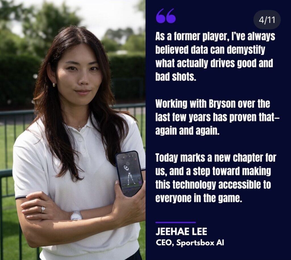 共同創設者である元LPGAツアー選手のジーへ・リーと、人工知能(AI)分野で20年以上の経験を持つベテランソフトウェアエンジニアのサムエル・メーカーによって設立されたSPORTSBOX AIは、ブライソンが世界中のゴルファー向けにAIトレーニング体験のインパクトとアクセシビリティを高めようとする上で理想的なパートナーです。