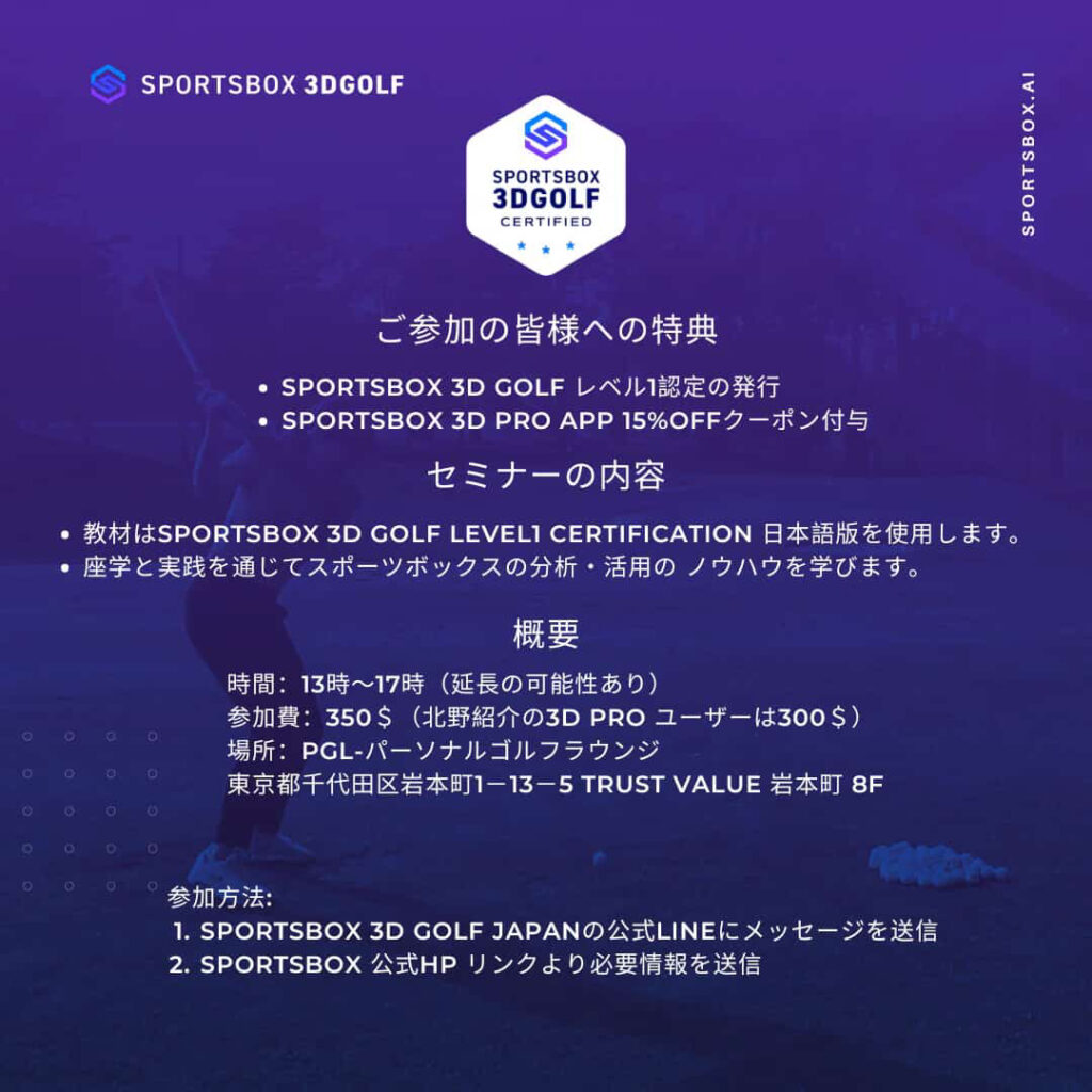 第6回 SPORTSBOX 3D GOLF LEVEL1 CERTIFICATIONライブイベントを5/12(火)にPGL-パーソナルゴルフラウンジにて開催致します!